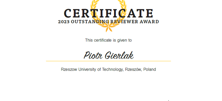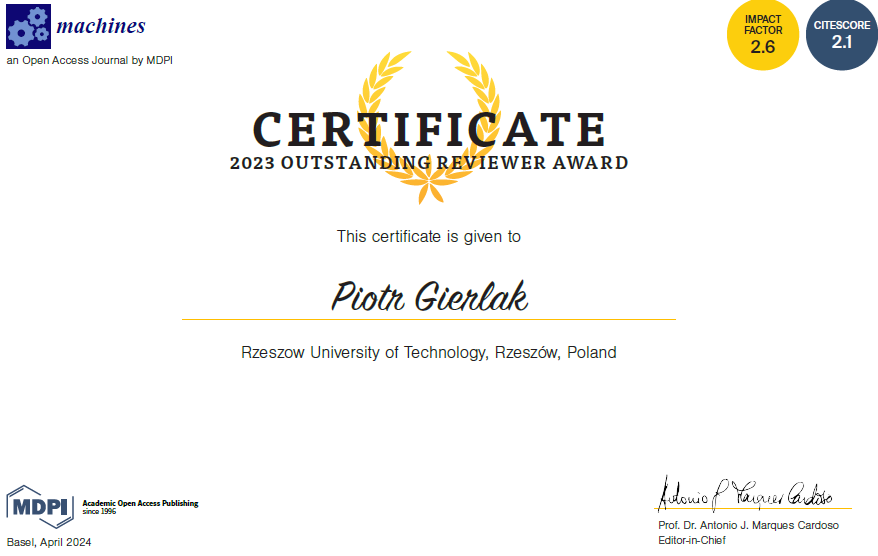 Dziękuję Radzie Redakcyjnej i zespołowi redakcyjnemu czasopisma Machines (MDPI) za niespodziewane wyrożnienie - Outstanding Reviewer Award 2023